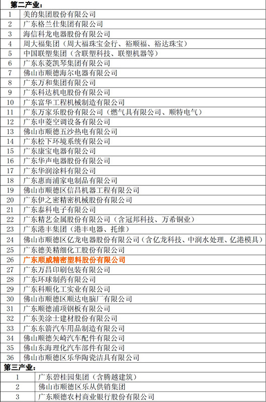 本報訊(記者 潘宏華)2014年7月24日,廣東省佛山市順德區(qū)經(jīng)科局在官網(wǎng)上公布了2014年度順德骨干企業(yè)名單(第一批)擬認定名單,共有39家企業(yè)在列,其中第二產(chǎn)業(yè)骨干企業(yè)有36家企業(yè),第三產(chǎn)業(yè)骨干企業(yè)有3家。廣東順威精密塑料股份有限公司(以下簡稱“順威股份”)順利入選第二產(chǎn)業(yè)骨干企業(yè)名單!