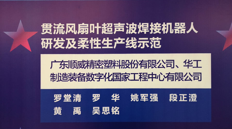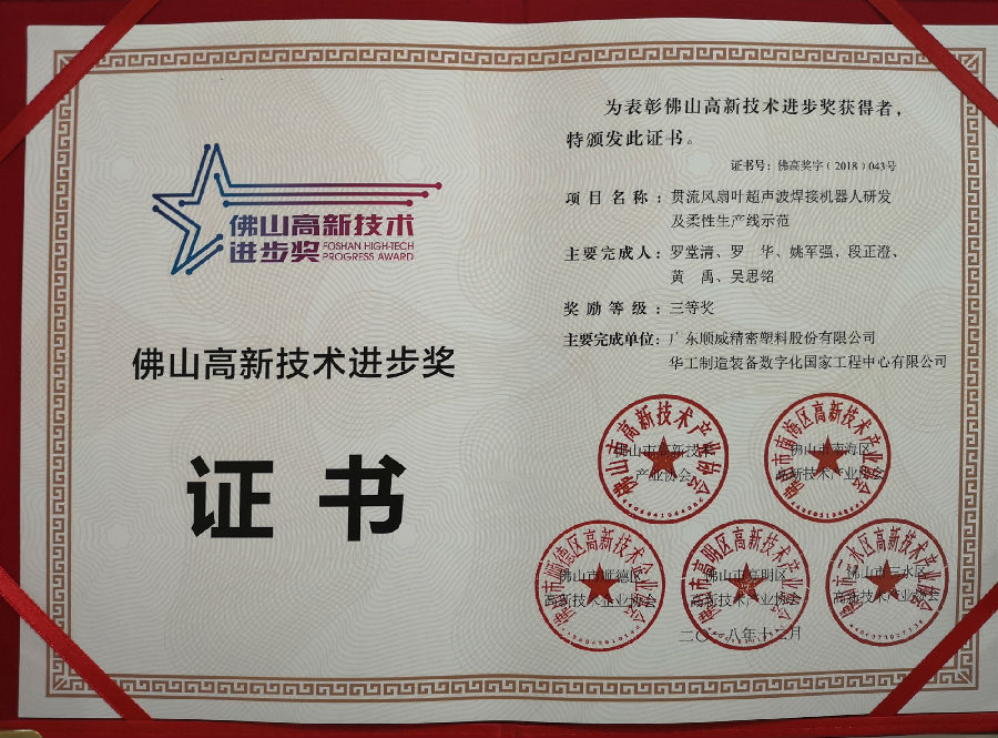 2019年1月18日,首屆“佛山高新技術進步獎”表彰大會在中歐中心國際會議中心隆重舉行,順威股份“貫流風扇葉超聲波焊接機器人研發及柔性生產線示范”項目喜獲三等獎。